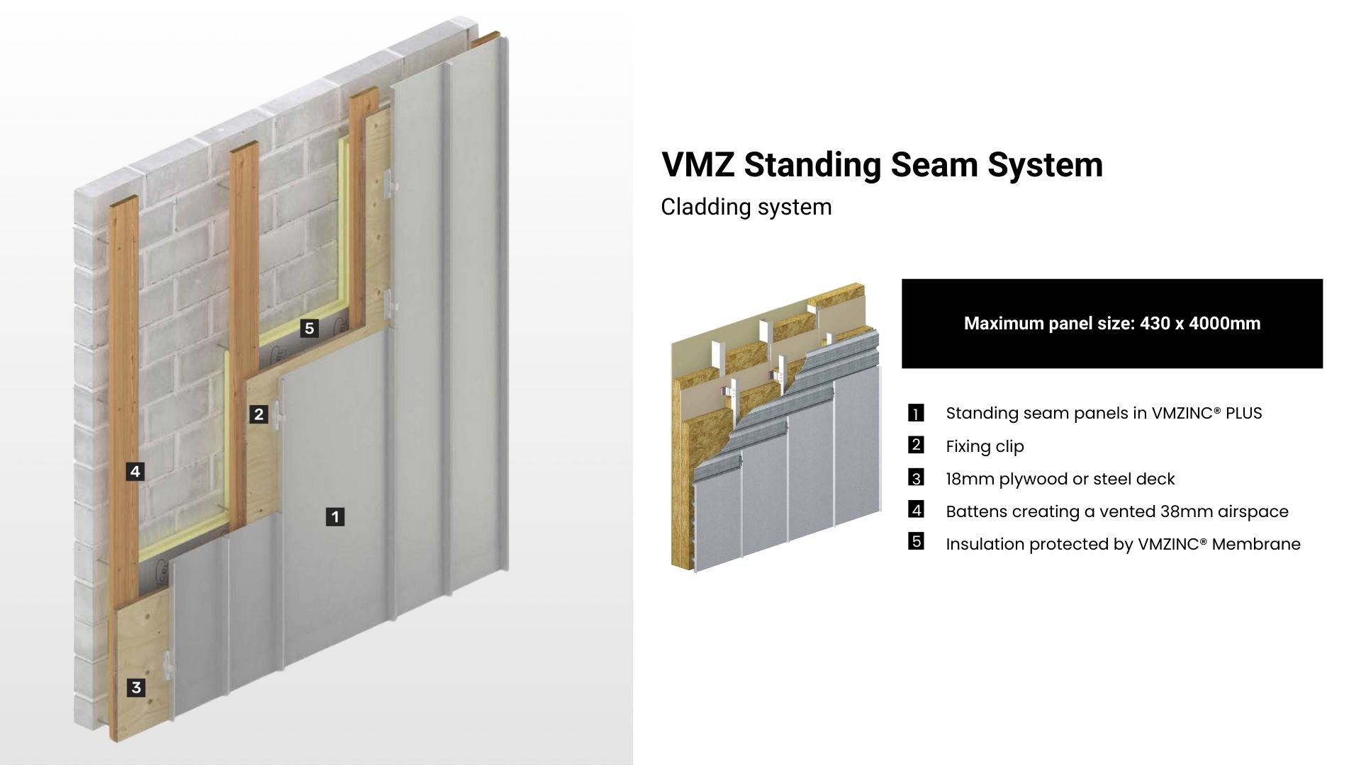 The VMZINC Standing Seam system is a ventilated cladding solution suitable for both new-build and refurbishment projects. As indicated by its name, the system is formed using raised seams that can be closed with either a single or double lock. For improved surface flatness, single-lock seams—sometimes referred to as angled seams—are often preferred. The system delivers a classic architectural appearance, with seams measuring 25 mm in height.