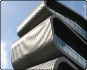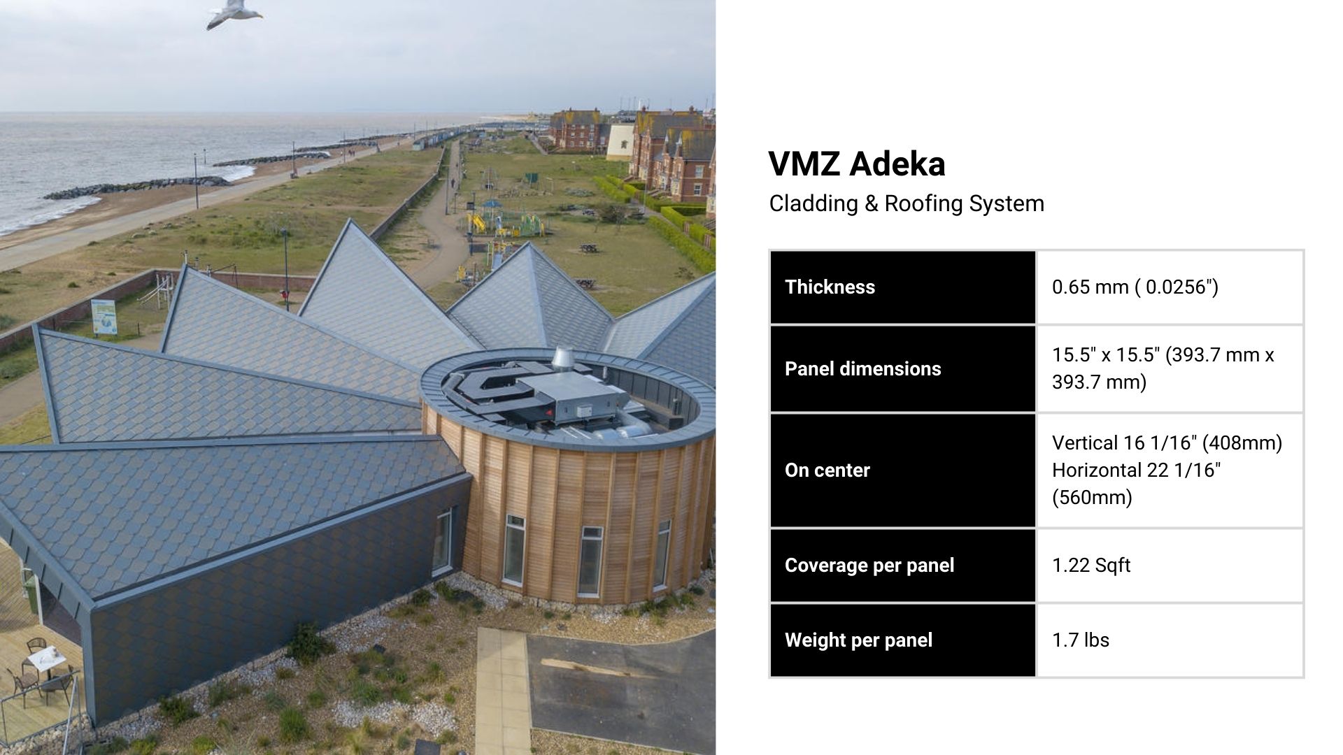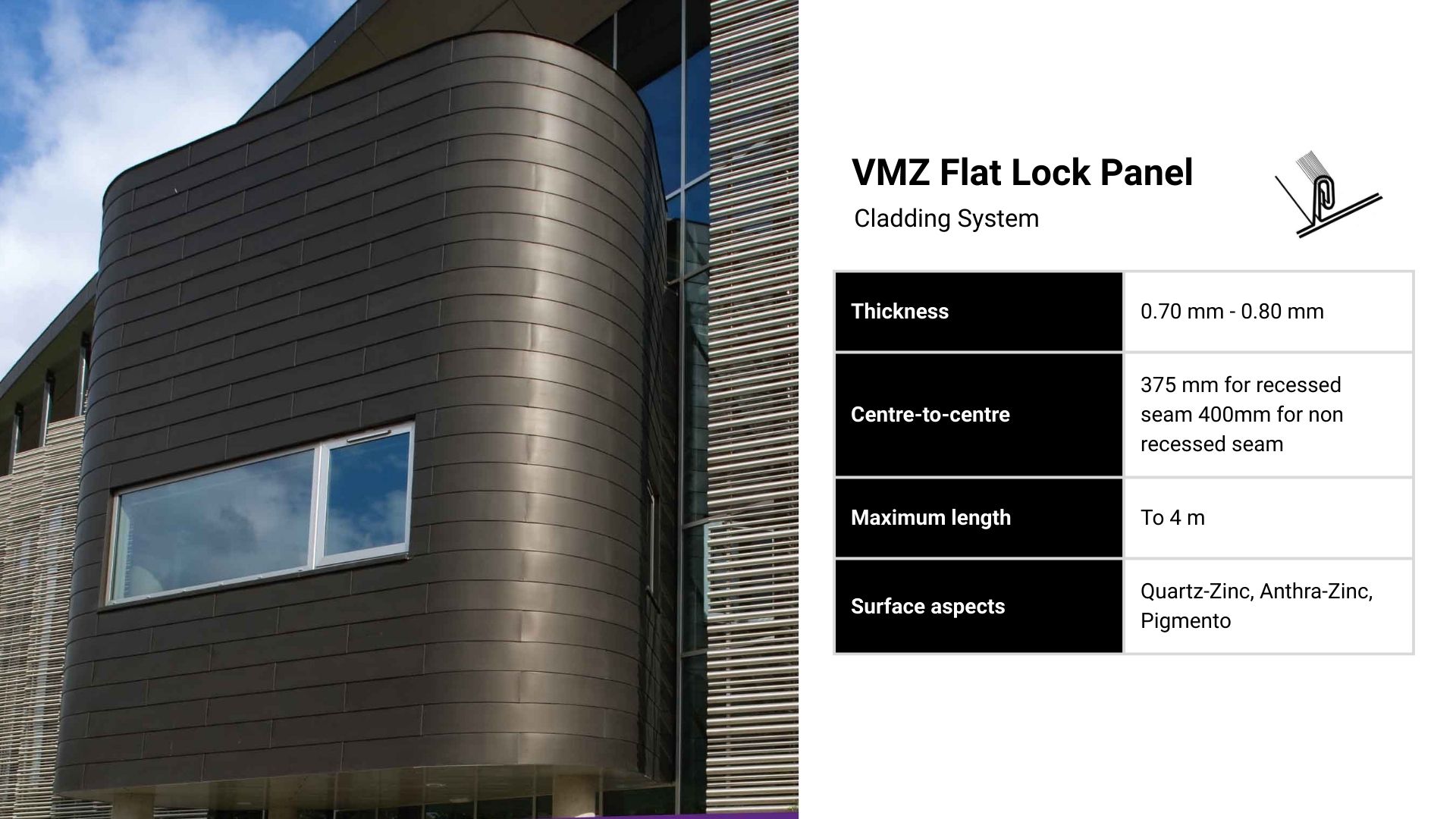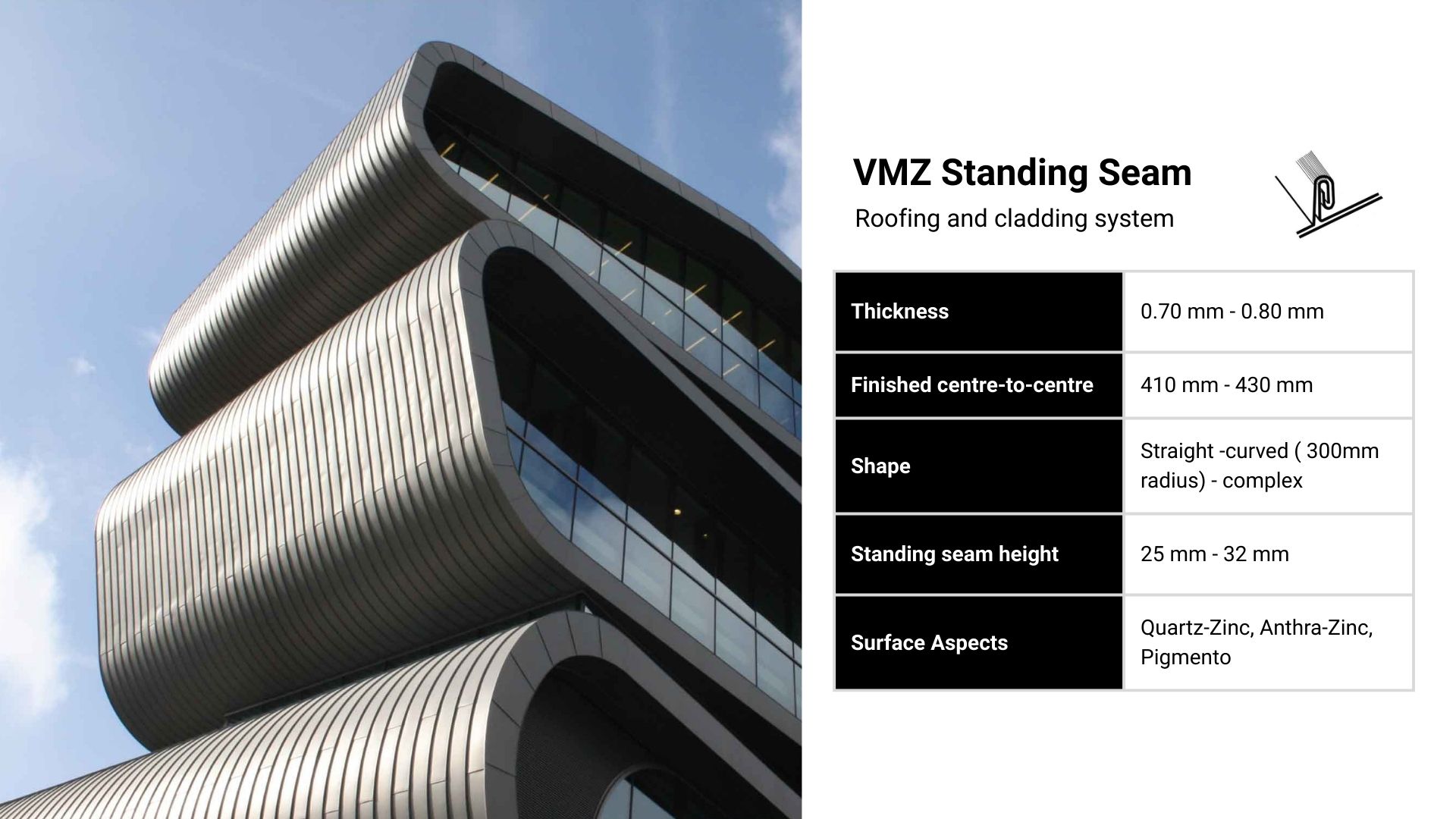 Panels may be installed vertically, horizontally, or on an incline, allowing the system to accommodate a wide range of wall geometries, including flat, curved, and complex shapes. A key advantage of this zinc façade solution is its versatility across both walls and roofs, enabling a seamless visual transition between the two (with double-lock seams required for roofing applications).