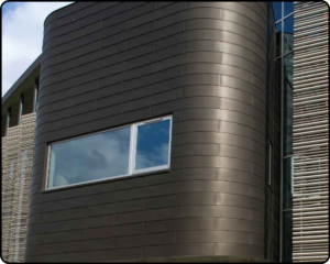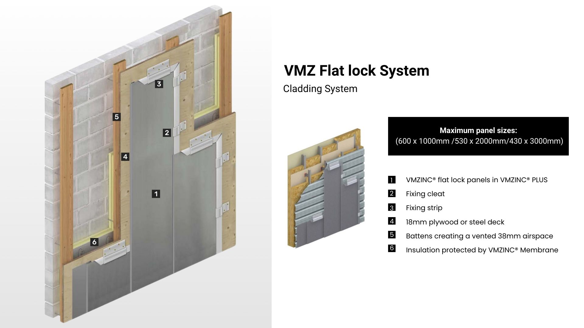 In earlier applications, conventional roofing systems such as standing seam panels were often used vertically as “roofs on walls.” Flat lock panels have also been in use for many years. Both systems rely on continuous ventilated substrates and are typically installed by specialist hard-metal roofing contractors.