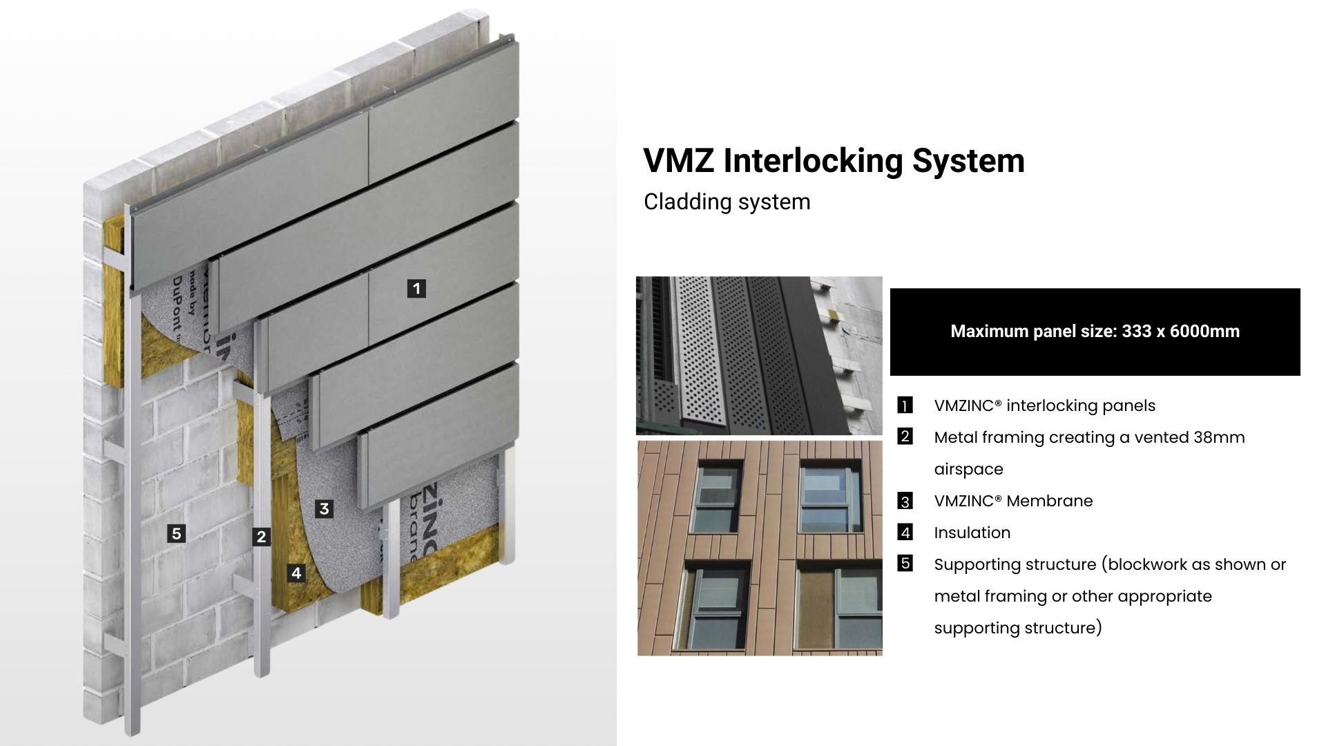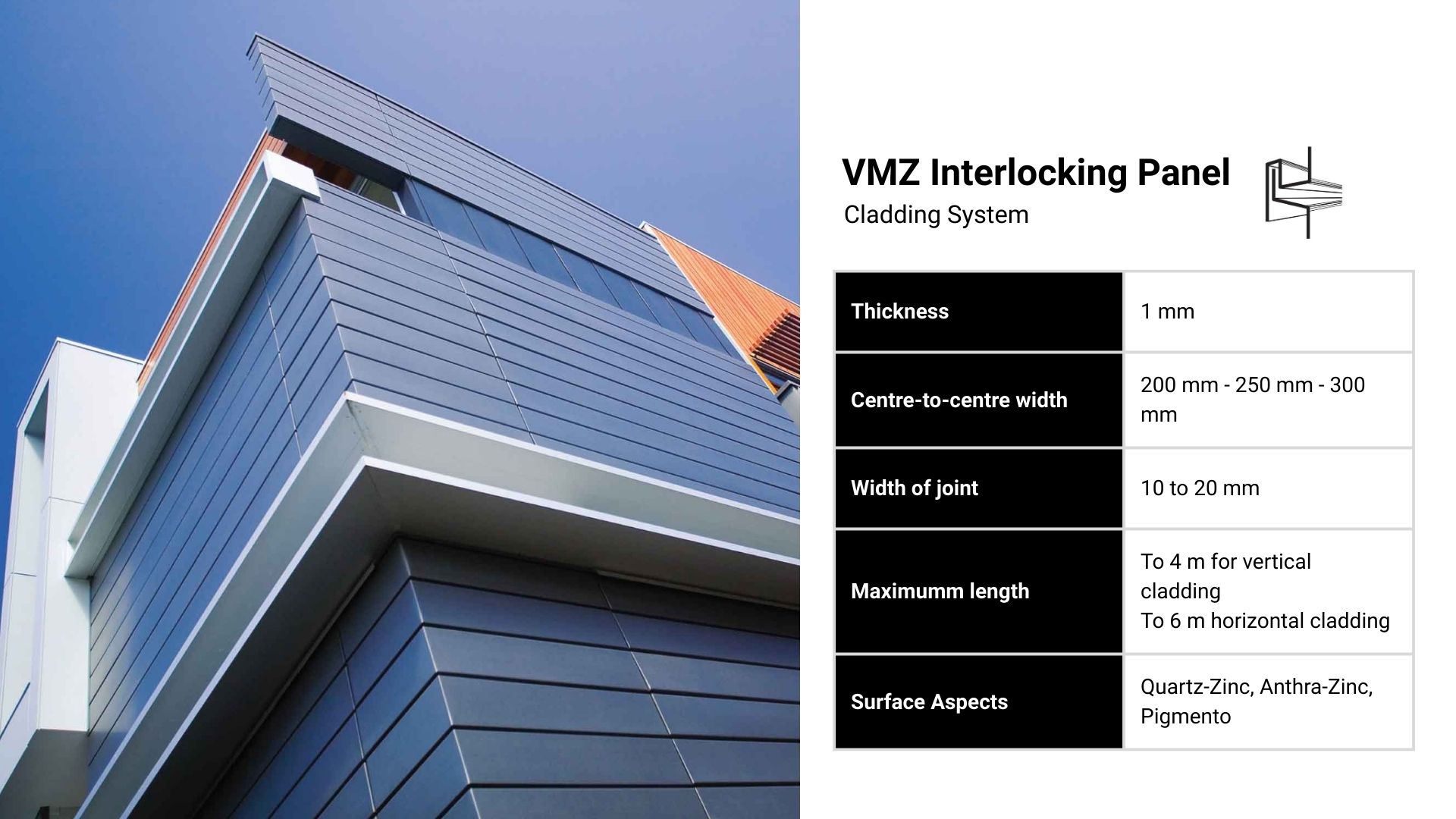 Interlocking panels are formed with a panel face and reveal joint and are secured using concealed fixings. The panels may be installed in horizontal or vertical orientations and are equally suitable for soffit applications. They are available in all VMZINC finishes with a standard thickness of 1 mm, and typical panel widths of 200 mm, 250 mm, and 300 mm.