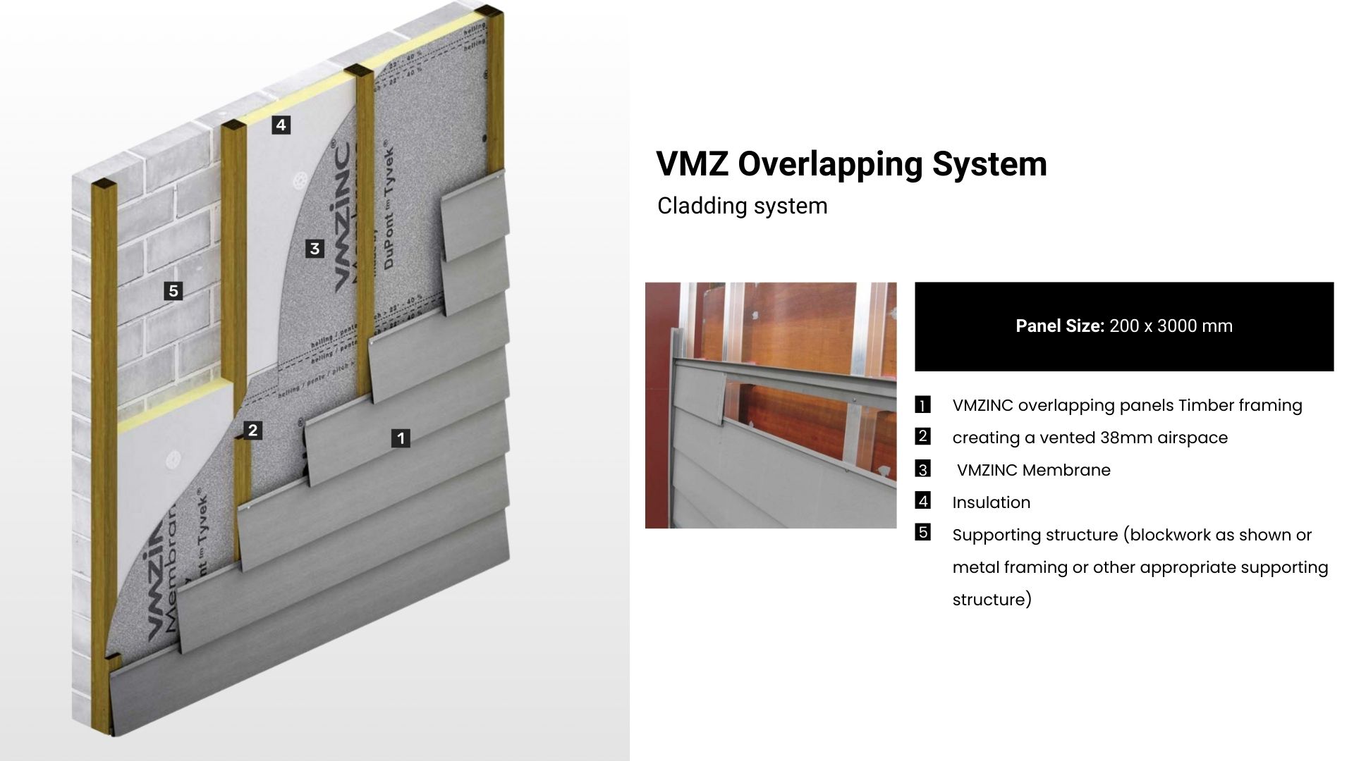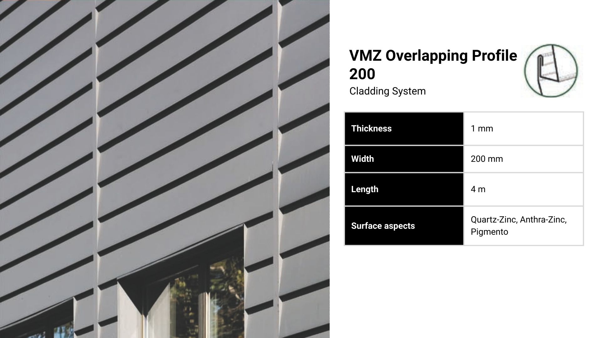 The overlapping panel system consists of a cost-effective set of panels and flashings designed for straightforward installation onto either timber battens or metal cladding rails. Fixing is carried out using screws or a nail gun, securing the panels without leaving visible fasteners. The panels have a 200 mm width and a 13 mm profile depth and are installed horizontally. They are supplied in 3 m lengths in QUARTZ-ZINC and ANTHRA-ZINC, with PIGMENTO and AZENGAR finishes available on request.