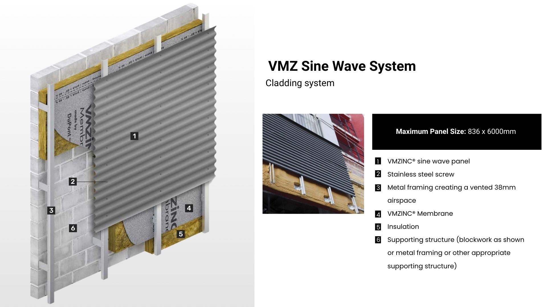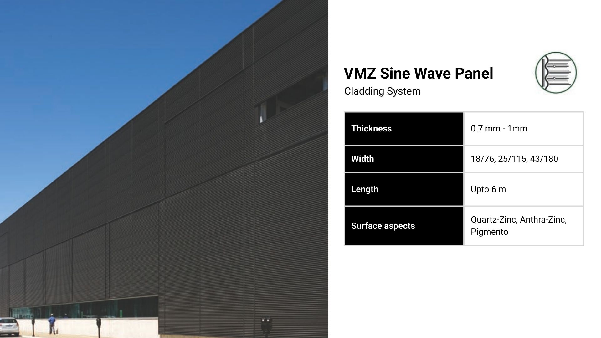 VMZINC Sine Wave is a corrugated zinc profile designed to be installed onto timber or metal substructures. It is one of the few VMZINC façade solutions that uses exposed fixings. The standard panel profile follows an 18/76 mm corrugation module and is available in 0.8 mm and 1.0 mm thicknesses. The system is suitable for horizontal or vertical wall applications. While Sine Wave can also be used for roofing, it must be installed in conjunction with an additional waterproofing layer.