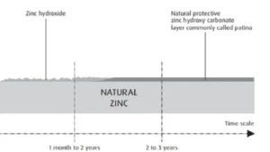 When zinc comes into contact with moisture, it initially forms zinc hydroxide, which then reacts with carbon dioxide (CO₂) in the air to create a stable zinc hydroxycarbonate layer. If zinc is exposed to excessive moisture without sufficient CO₂, this stable grey patina cannot develop, leaving behind unstable zinc hydroxide, commonly known as white rust.